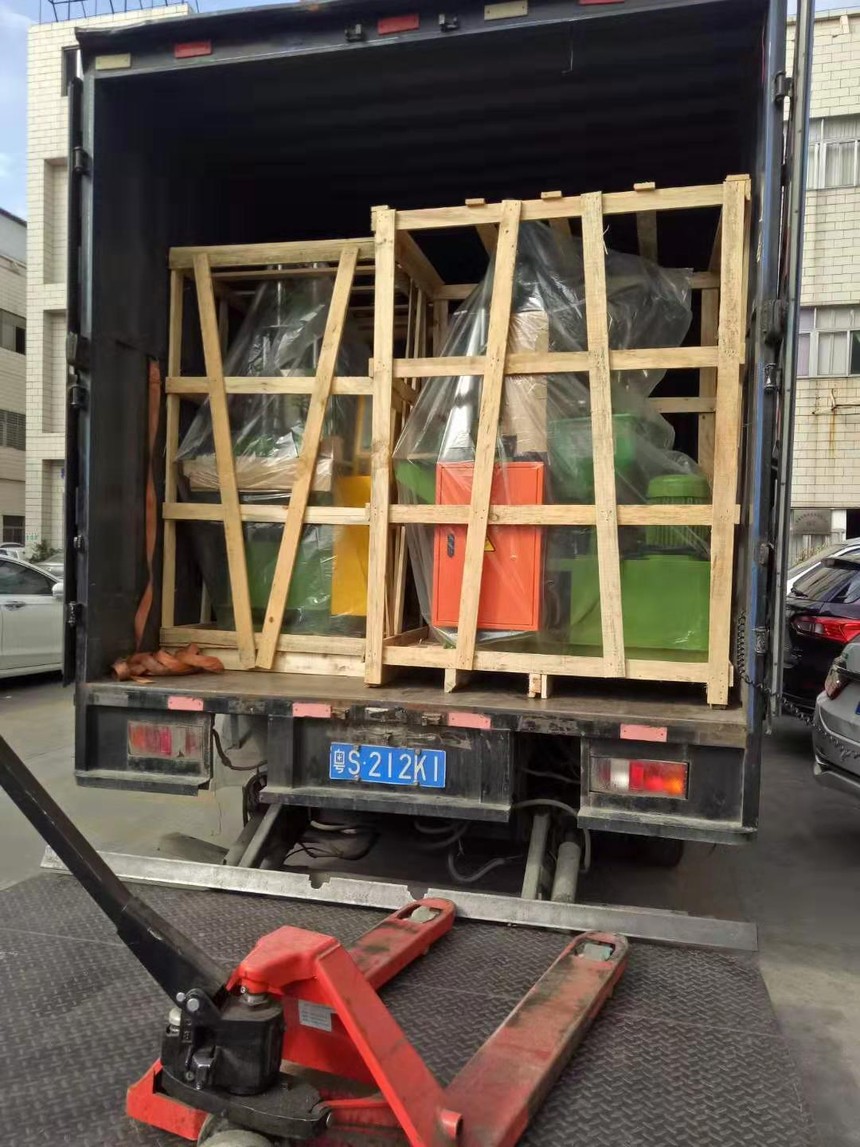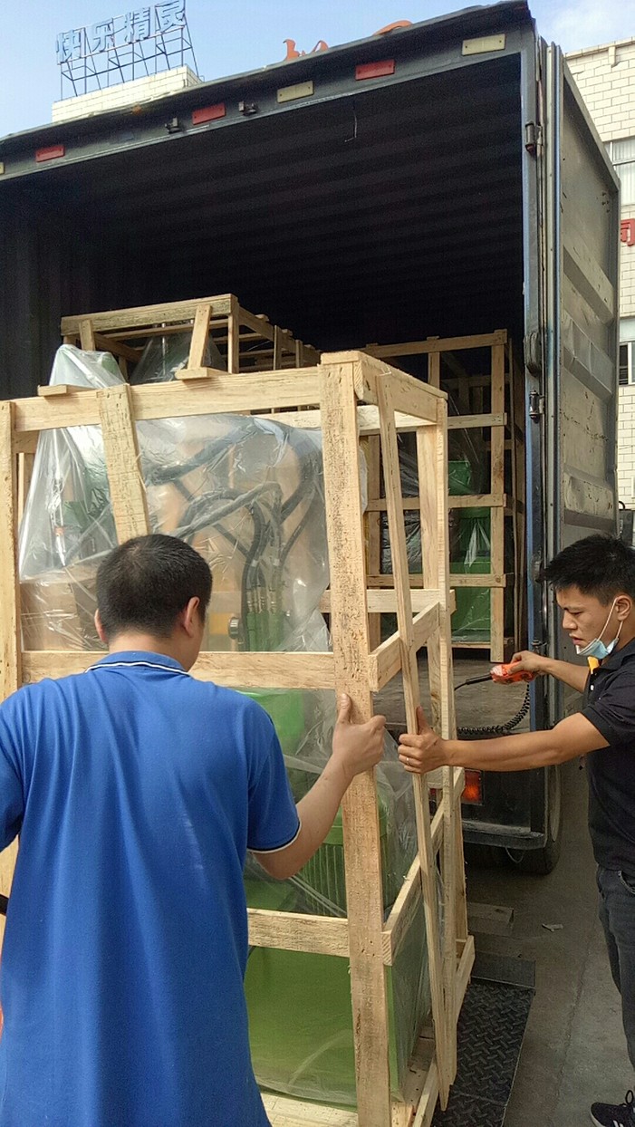 ,幾(jǐ)個裝車師傅(fu)把立式注塑(su)機打包好,裝(zhuāng)入貨車中,随(sui)即貨車發出(chu)。
