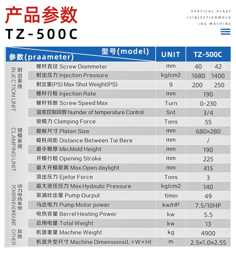 TZ-550C型電源(yuan)連接線專(zhuan)用立式注(zhù)塑機特性(xing): 1、立式合模(mó),卧式射出(chu),機體結構(gou)緊湊,射出(chū)有力,适合(he)🔞大🔞型鑲⭐件(jiàn)成‼️型 2、C型機(jī)體,操作無(wú)柱子妨礙(ai),速度快 3、射(she)台高低,可(kě)上下調整(zhěng) 4、可加裝滑(hua)闆、圓盤、提(tí)高工作效(xiao)率