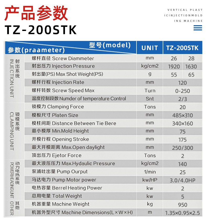 1、立式合(he)模,立式射出,低(dī)壓關模裝置,保(bǎo)護模具和人身(shēn)安全 2、三段溫度(du)控制,射速,背壓(ya),螺杆轉速無極(jí)調整,适合各👌種(zhong)精密塑膠件成(cheng)型 3、料管可升降(jiàng)。清料頭方便,固(gu)定模具更容易(yì)