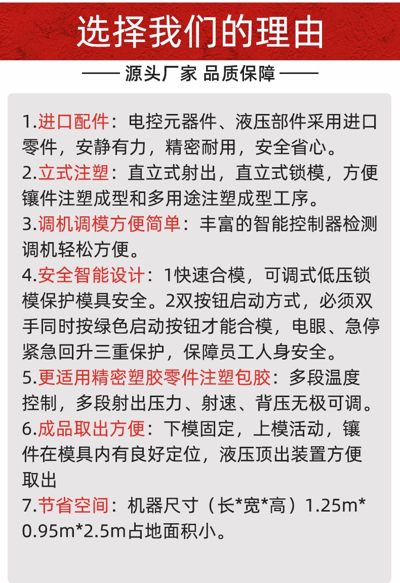 特性: 1.立式合模(mó),卧式射出,機體(tǐ)結構緊湊,射出(chū)有力,适合較大(da)型鑲件成型。 2.C型(xíng)機體,操作無柱(zhu)子妨礙,速度快(kuai)。 3.射台高低,可上(shàng)下調整。 4.可選加(jiā)裝滑闆、圓盤、提(ti)高工作效率。